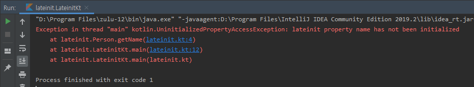 위와 같이 lateinit 프로퍼티인 name이 초기화되지 않았다는 에러가 발생합니다.
