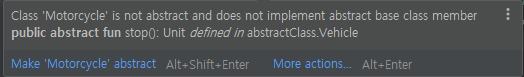 모든 추상 프로퍼티와 추상 메서드를 구현하지 않으면 컴파일러에서 오류를 반환하는 것을 확인할 수 있습니다.