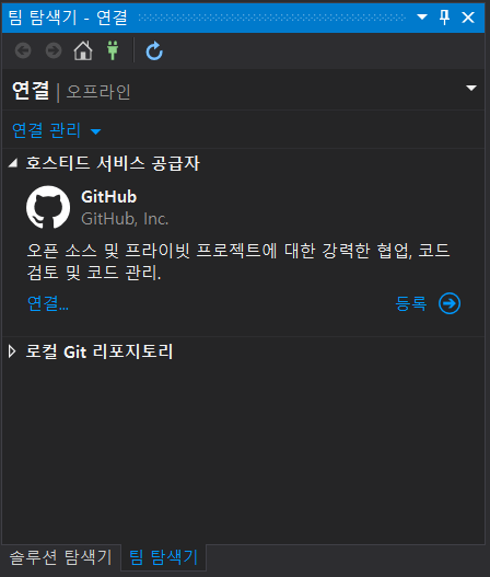 재시작 후 "팀 탐색기" 창을 열어보면 "호스티드 서비스 공급자"에 "GitHub"이 추가된 것을 확인할 수 있습니다.