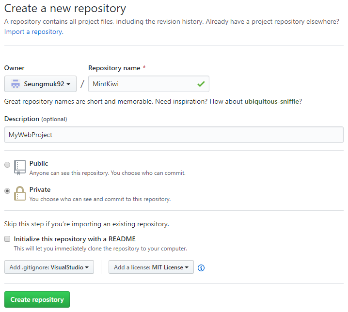 GitHub에 로그인한 후 사용할 원격 저장소를 미리 생성해 둡니다.