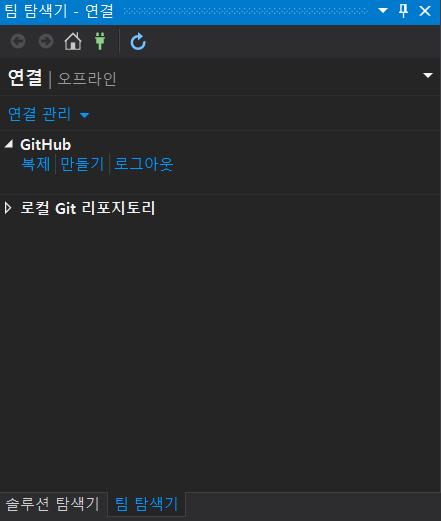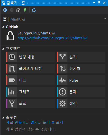 복제에 성공하면 "팀 탐색기"에서 좌측과 같은 화면을 확인할 수 있습니다.