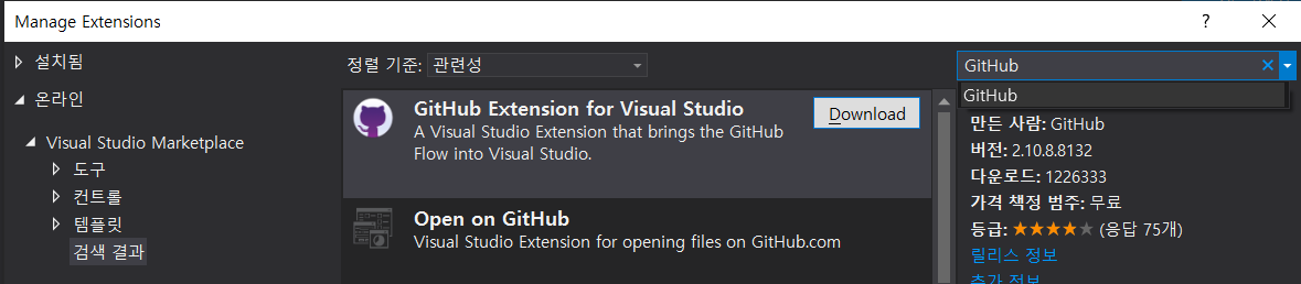 VS2019를 킨 후 확장 -> 확장 관리를 연 후 "GitHub Extension for Visual Studio"를 설치합니다.