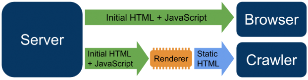 "현재는 자바 스크립트를 처리하기가 어렵고 모든 검색 엔진 크롤러가 자바 스크립트를 성공적으로 또는 즉시 처리할 수 있는 것은 아닙니다. 앞으로는 이 문제를 해결할 수 있기를 희망하지만 그동안 이 문제에 대한 해결 방법으로 동적 렌더링을 권장합니다. 동적 렌더링은 특정 사용자 에이전트에 대해 클라이언트 측 렌더링 콘텐츠와 사전 렌더링 된 콘텐츠 간 전환을 의미합니다."