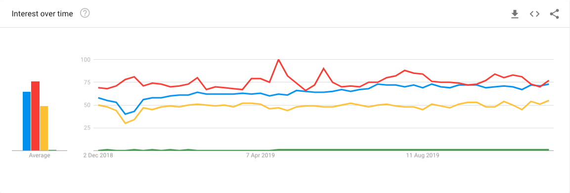 2019년의 Raact(파란선), Vue(빨간 선), Angular(노란 선), Svelte(초록선)에 대한 검색량에 의하면 Vue는 React보다 약간 우위에 있습니다. Angular는 자리를 지키지 못하고 있으며 Svelete는 이 비교에서 아무런 역할을 하지 못하고 있습니다.
