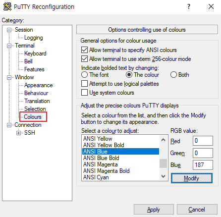 폰트 컬러 설정은 다음과 같이 설정 > Wondow > Colours에서 변경할 수 있습니다.