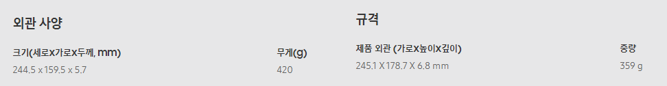 극히 일부의 사용자를 제외하고 일반적으로 태블릿은 휴대성에 포커스를 맞추고 구매를 하실 겁니다. 갤럭시 탭 S6의 공식 스펙은 다음과 같습니다.