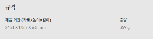 두께고 5.7mm입니다. 본체만 놓고 보면 상당히 얇은 두께를 갖습니다. 그럼 키보드 커버의 공식 스펙을 알아볼까요?