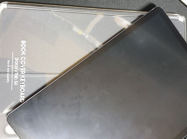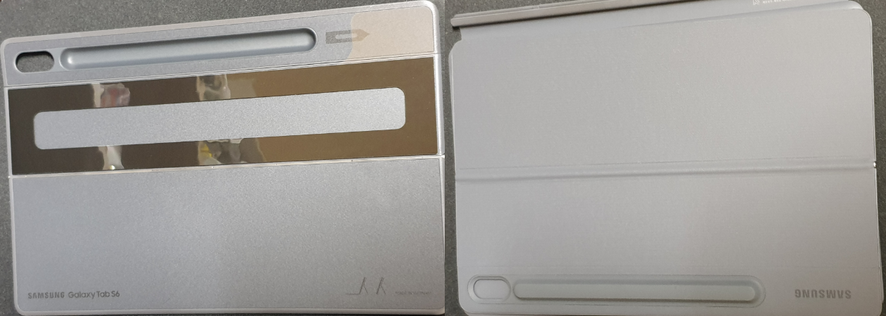 후면 커버입니다. 비닐로 덮인 검은 부분이 TabS6와 부착하는 접착테이프입니다.