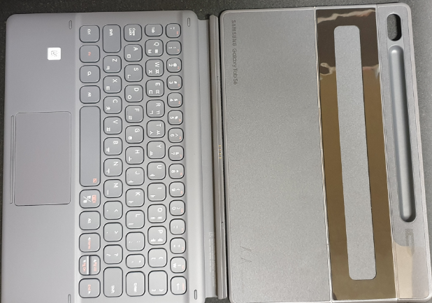이전 탭 S4의 키보드 커버는 터치패드가 없는 대신 포고핀이 키보드 커버 중간에 있었습니다. 따라서 뒤로 접었을 때 자연스레 포고핀이 분리되어 키보드가 동작하지 않았습니다.