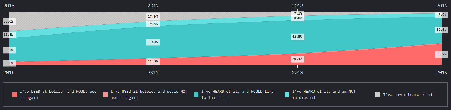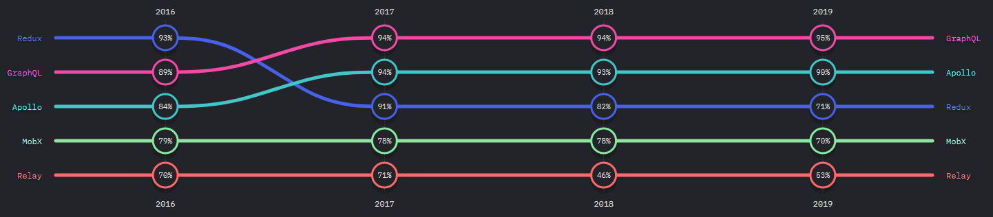 GraphQL은 페이스북에서 만든 쿼리 언어입니다. GrpahQL은 JavaScript 개발 환경에서 Data Layer와 관련하여 항상 언급되는 주제입니다만, 현재를 기준으로 아직 성숙한 쿼리 언어라곤 할 수 없습니다. 하지만 등장한 지 얼마 되지 않았음에도 불구하고, GraphQL의 인지도와 인기는 매우 빠르게 상승하고 있음을 확인할 수 있습니다.