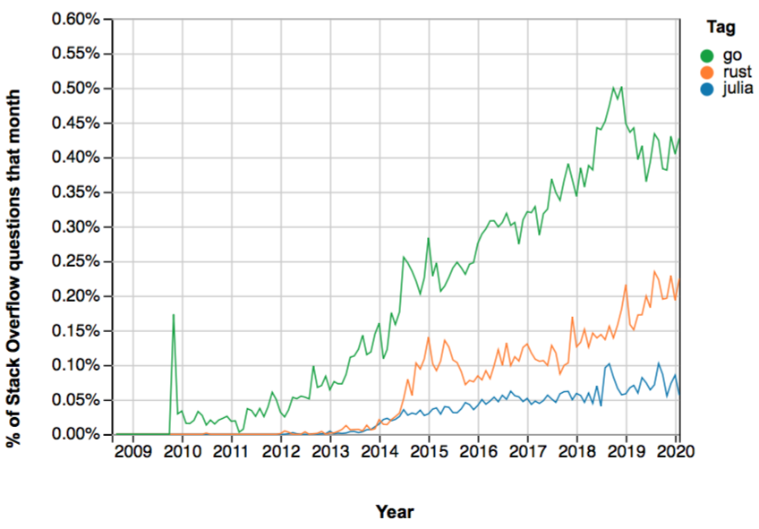 시장에 다른 언어들이 존재하지만 Rust, Go, Jilia는 파이썬을 조금만 수정하는 언어들입니다. 이러한 언어들은 모두 아직 오지 않은 기술들에 있어서 뛰어납니다. 특히 인공지능 분야에서 가장 주목할만합니다. 스택 오버플로우 태그의 수에 반영된 것처럼 아직 시장 점유율은 낮지만 이러한 언어들 모두의 트렌드는 상승할 것이 명확합니다.
