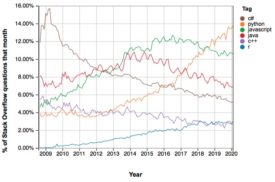 파이썬의 성공은 플랫폼의 포스트에 있는 태그의 수를 측정하는 스택 오버플로우 트렌드에 반영됩니다. 스택 오버플로우의 크기로 볼 때 이는 언어 인기에 꽤나 좋은 지표입니다.