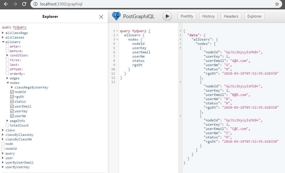 단지 allUsers->nodes를 클릭한 후 컬럼을 순서에 맞게 클릭했을 뿐입니다. 여기서 nodeId라는 것이 보일 텐데 이 id는 postgraphile내에서 node마다 유지되는 고유한 ID입니다.
