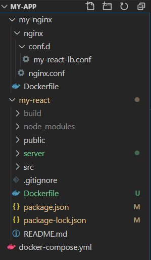 이런 식으로 docker-compose를 구성하게 되면 위의 세 컨테이너 간에는 서비스에 작성한 이름으로 서로 접근이 가능해집니다. 따라서 우리의 my-react-lb.conf가 바뀌어야 함을 의미하죠.
