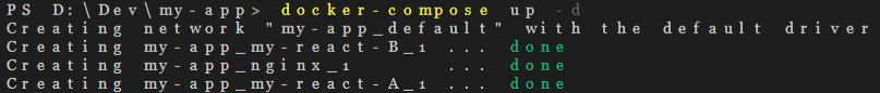 여기서 서비스 항목을 봅시다. 우리는 my-react-A, my-react-B, nginx 이렇게 총 세 개의 컨테이너를 생성하도록 작성하였습니다. 당연히 이름은 변경해도 됩니다. 서비스 내의 image는 도커 이미지를 의미합니다. ports는 docker run의 -p 옵션과 동일합니다.