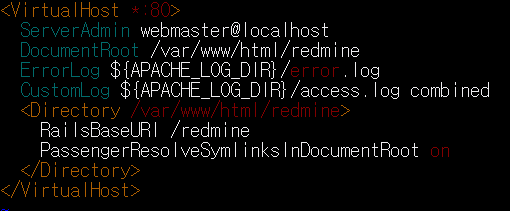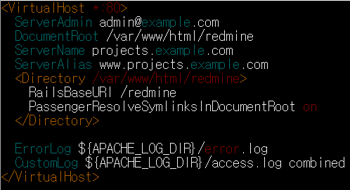 /etc/apache2/sites-available 폴더에 Redmine.conf 파일을 생성 한 뒤 다음과 같이 작성합니다.
