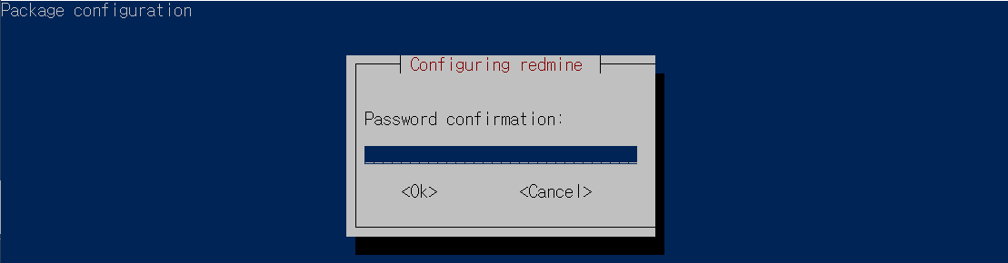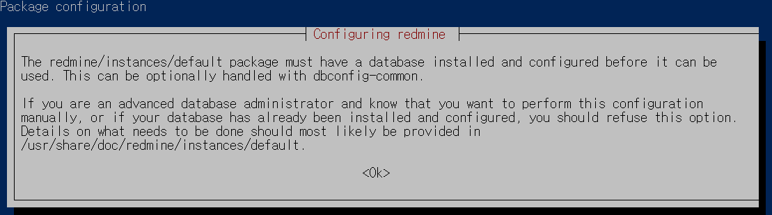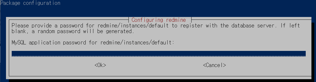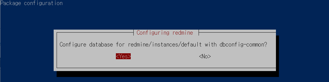 설치를 진행하다 보면 "Configuring redmine" 화면이 나타납니다. 설정을 진행해 줍시다.