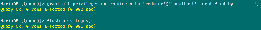 > GRANT ALL PRIVILEGES ON redmine.* TO 'redmine'@'localhost' IDENTIFIED BY 'P@SSWORD';