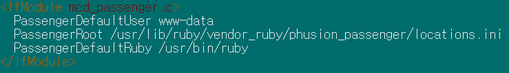 설치 완료 후 Apache passenger 모듈의 설정 파일을 다음과 같이 수정합니다.