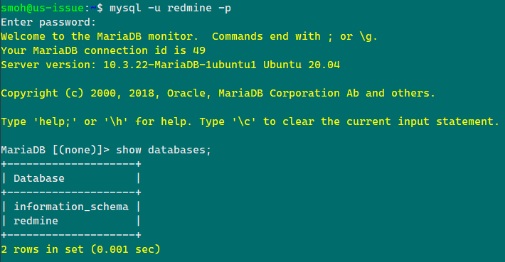$ mysql -u redmine -p