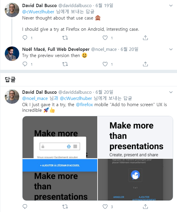 나는 안드로이드에서 Firefox 모바일의 "홈 화면에 추가"UX를 시도해 보았습니다. 믿거나 말거나 그것이 실제로 최고라고 생각합니다. 크롬은 훌륭하지만 파이어 폭스는 나의 손을 이끌리게 했으며 "이봐 David 내가 여기 PWA를 네 폰에 올바르게 추가하는 방법을 보여줄게"라고 말하는듯한 느낌이 들었습니다.