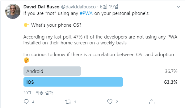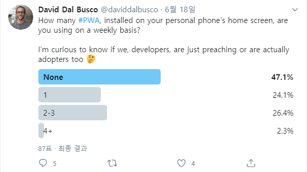 글이 오롯이 PWA의 채택률에 집중되어 있지 않다는 생각이 들긴 하지만 설문으로 얻어진 수치만을 보더라도 충분의 의미가 있다고 생각합니다.