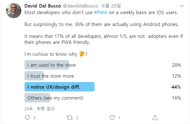 안드로이드에서 PWA를 사용하지 않는 전체의 7%에서 대부분의 개발자인 44%는 스토어나 Google Play의 UX나 디자인이 좋다고 느끼기 때문에 PWA를 사용하지 않습니다.