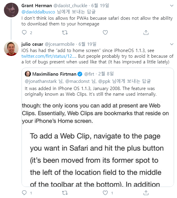 부분적인 지원보다 제가 받은 의견에 따르면 개발자들은 애플이 자동으로 "홈 화면에 추가하기"를 보여주지 않기 때문에 iOS에서 PWA 사용을 포기하는 것 같습니다. 애플은 Apple은 다른 브라우저를 통해 이러한 기능을 애플 기기에 구현하지 못하게 했습니다.