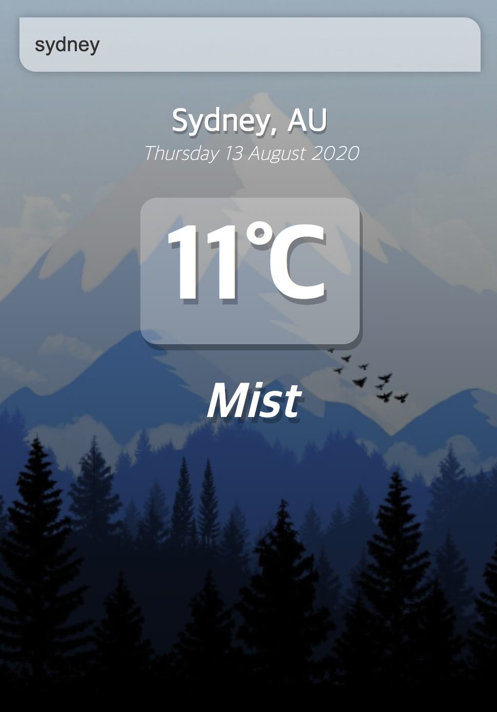이제 서울을 검색하니 백그라운드 이미지가 따뜻한 이미지로 변경되었습니다. 혹시 모르니 추운 도시를 검색해 봅시다. 남반구는 8월 지금 겨울입니다. 시드니를 검색해 보세요.