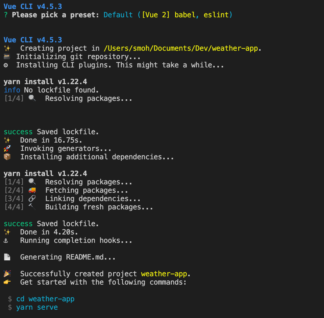 위와 같이 vue-cli 설치가 완료되면 이제 vue 프로젝트를 생성할 준비가 다 되었습니다. 다음 명령어를 통해 vue 프로젝트를 생성해 봅시다.