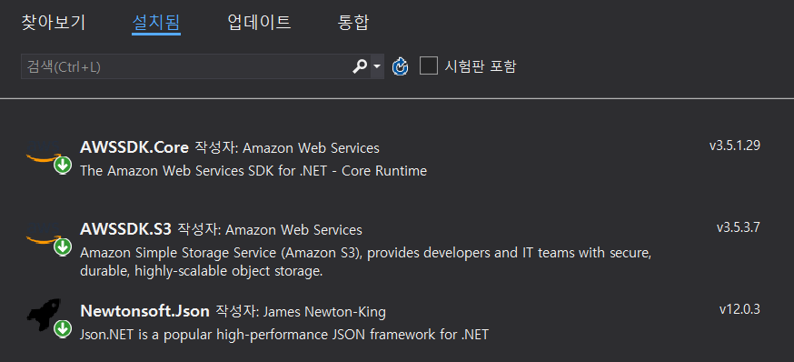 S3 compatible Object Storage를 사용하므로 우선 ASW SDK를 설치해 줍니다. Nuget을 통해 AWSSDK.Core와 AWSSDK.S3를 먼저 설치해 줍니다. 그리고 추후 구현할 파일 리스트 조회를 위해 Json 관련 패키지도 같이 설치해 줍니다.