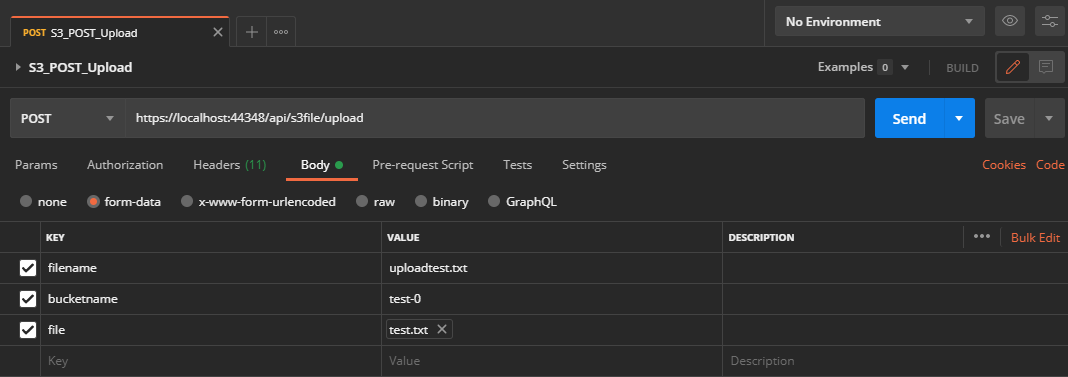 위와 같이 POST 요청을 준비합니다. 엔드포인트는 호스트, 디버그 포트, 컨트롤러를 이용해 자신의 환경에 맞게 수정해 줍니다. filename은 버킷에 저장될 파일의 이름이고 bucketname은 파일이 저장될 버킷의 이름입니다. file은 아무거나 업로드 할 파일을 골라주세요.