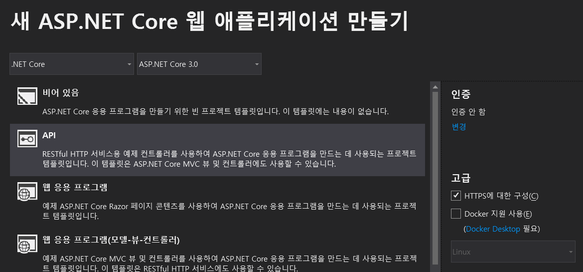 IDE는 Visual Studio 2019 CE를 사용하였으며 AST.NET Core 버전은 3.0을 사용했습니다.