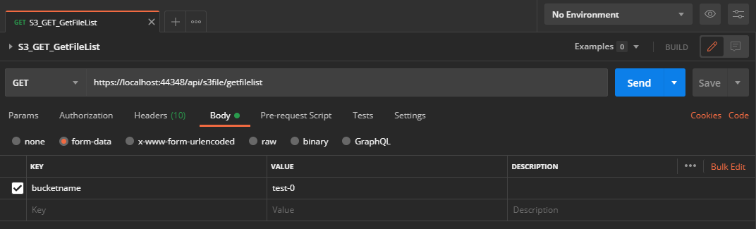 요청 주소를 자신의 환경에 맞게 수정한 뒤 bucketname을 파일을 업로드한 버킷 이름으로 설정해 준 뒤 Send 버튼을 클릭합니다.