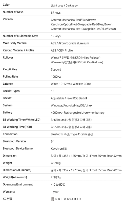 제가 구매한 모델은 키크론 K8 RGB 알루미늄 프레임에 옵티컬 핫스왑 적축 모델입니다.