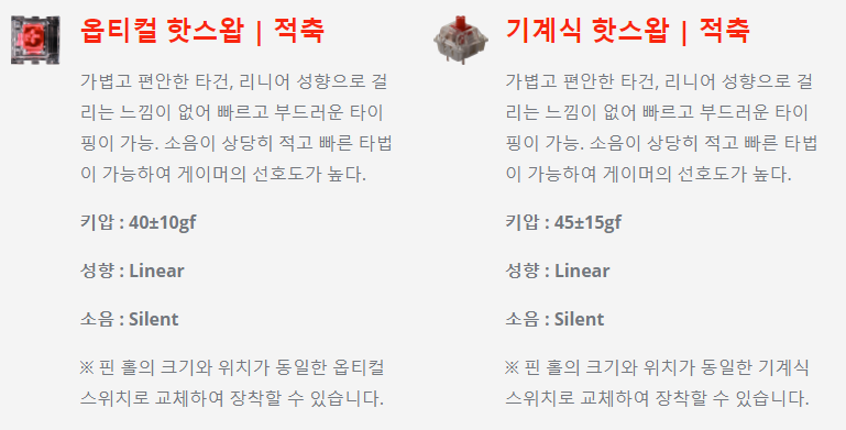 일단 이 키보드는 기계식입니다. 당연히 어느 정도의 소음은 감내하셔야 합니다. 소음이 정말 싫다 하시는 분은 무접점이나 저소음 적/갈축 키보드를 추천드립니다. 키압은 다른 축에 비해 확실히 낮은 편입니다. 집에서 사용하고 있던 45g 무접점과 유사합니다. 키압이 가장 낮은 옵티컬 적축이지만 소음은 존재합니다. 하지만 리니어 적축인데 걸리는 소리가 들리는 기분입니다. 키캡을 빼고 축만 눌러보면 그런 소리가 안 나는데 미묘합니다.