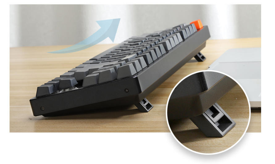 키크론 키보드들의 높이가 꽤 있다는 건 잘 알려져 있습니다. 전 약간 기울어져있는 걸 선호하기 때문에 뒤에 기울기를 조절할 수 있는 걸 펴서 씁니다 높이 조절은 접혀 있는 부분을 펴서 2단으로 조절할 수 있습니다.
