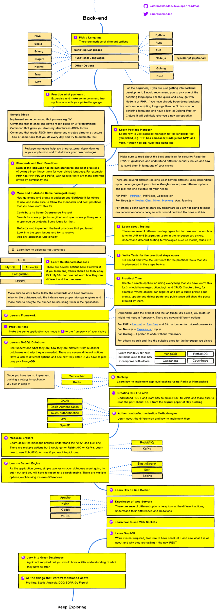 2021년에 백엔드 개발자가 되고 싶다면 다음의 백엔드 개발자 로드맵을 따를 수 있습니다. 다시 말하지만 강조된 노란 박스의 핵심 기술들로부터 시작하고 거기서 성장해 나갈 수 있습니다.