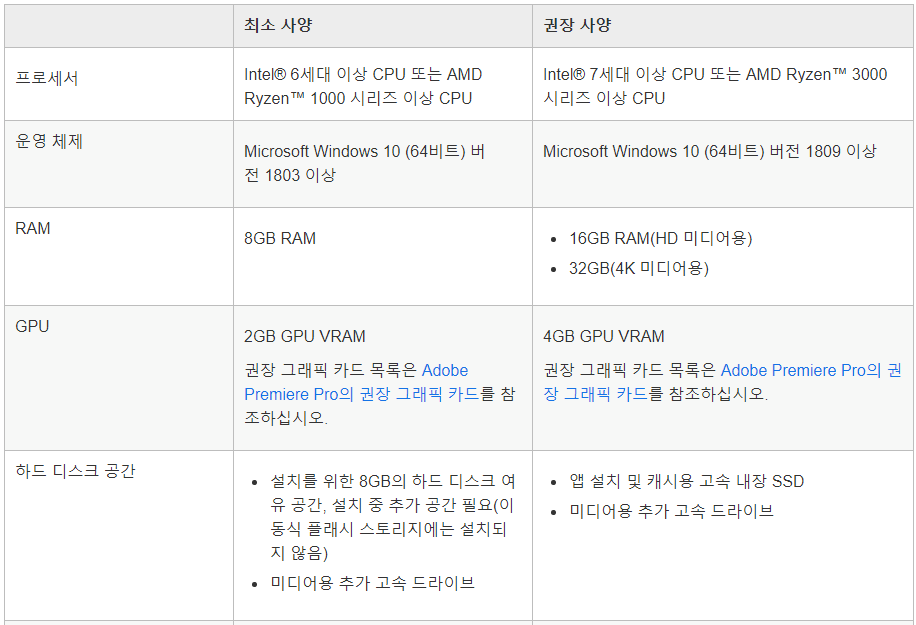 영상을 편집할 때 고사양의 컴퓨터를 사용해야 합니다. 적정 메모리가 32GB에 달 할 정도로 많은 RAM이 필요하며 인텔의 i7이상의 높은 사양의 프로세서, SSD, 렌더링 속도를 높이기 위한 좋은 그래픽 카드가 필요합니다. 프리미어는 이러한 권장사항이 요구되며 많은 리소스를 사용합니다.