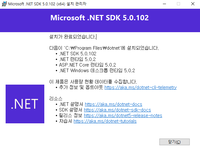 가장 먼저 떠올릴 수 있는 해결책이었습니다. Microsoft 공식 홈페이지로 이동해 dotNet 5.0 SDK를 새로 다운로드하여 제거 후 다시 설치했습니다.