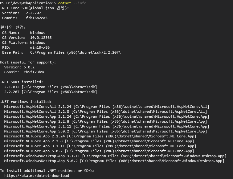 시스템 변수를 수정하고 다시 터미널을 열고 dotnet 버전을 확인하기 위해 "dotnet --info"를 입력합니다.