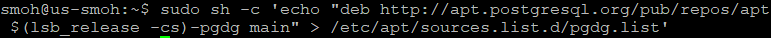 > sudo sh -c 'echo "deb http://apt.postgresql.org/pub/repos/apt $(lsb_release -cs)-pgdg main" > /etc/apt/sources.list.d/pgdg.list'