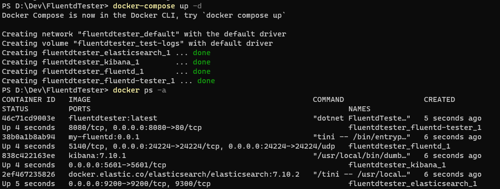 내용은 간단합니다. 앞서 빌드한 이미지인 fluentdtester:latest와 my-fluentd:0.0.1 그리고 elasticsearch와 kibana를 실행시킵니다. fluentd-tester와 fluentd 서비스는 test-logs라는 이름의 볼륨을 이용해 데이터를 공유하도록 해주었습니다.