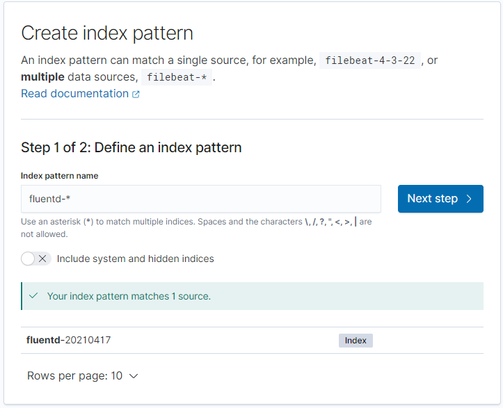 Create index 화면에서 "fluentd-*" 패턴을 생성해줍니다.