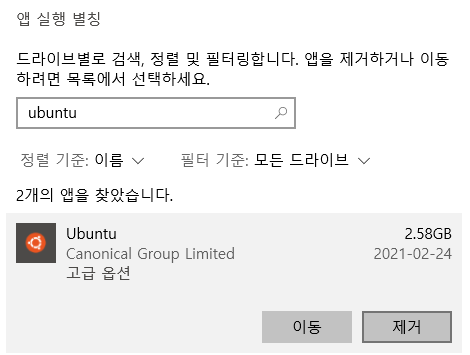 앱 실행 별칭에 "Ubuntu"를 검색합니다. 구식 우분투를 선택한 뒤 "제거"를 진행해 주면 됩니다.