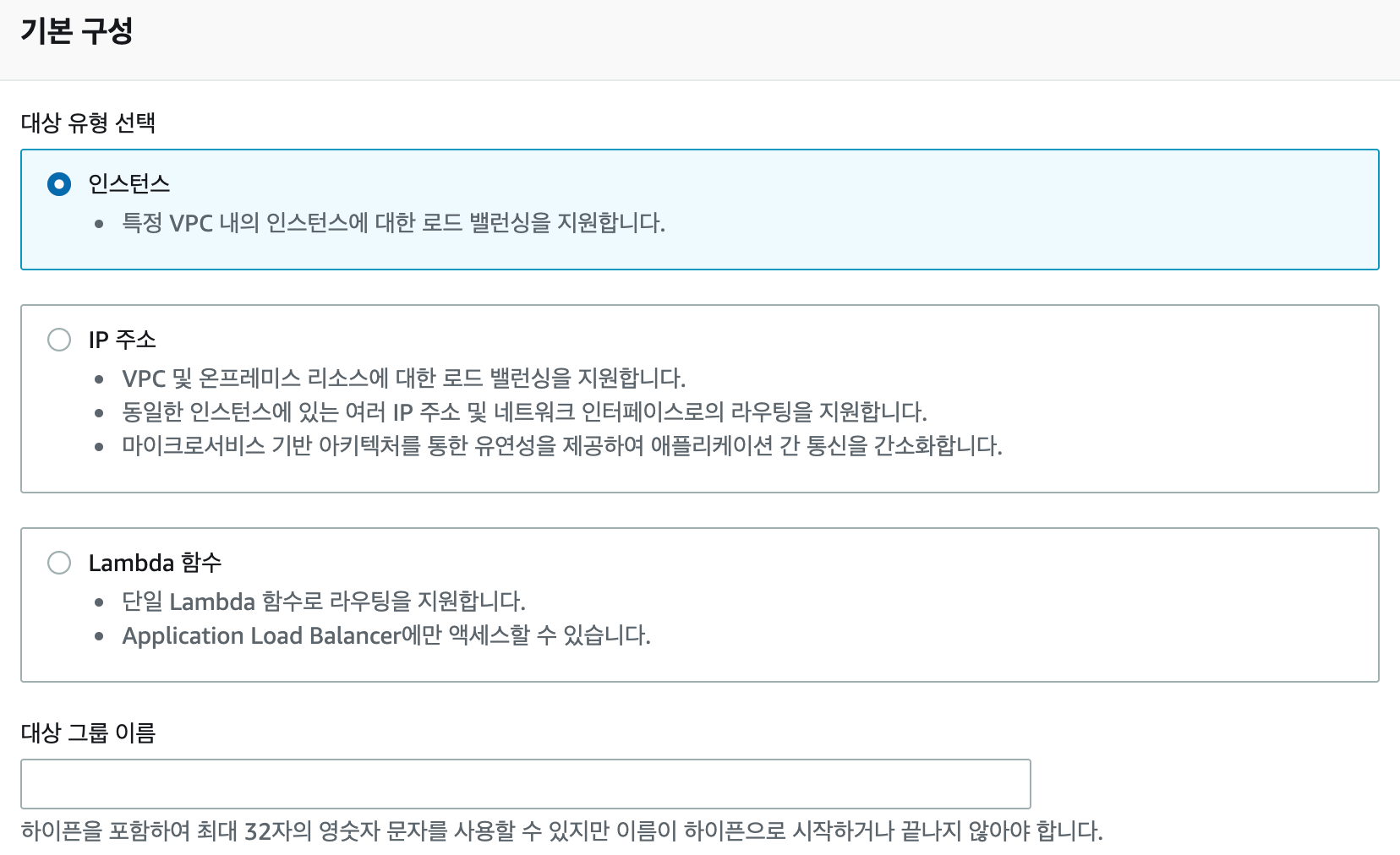 2. 대상 유형은 인스턴스를 선택 한 뒤 대상 그룹 이름을 작성하고 다음을 클릭하세요.