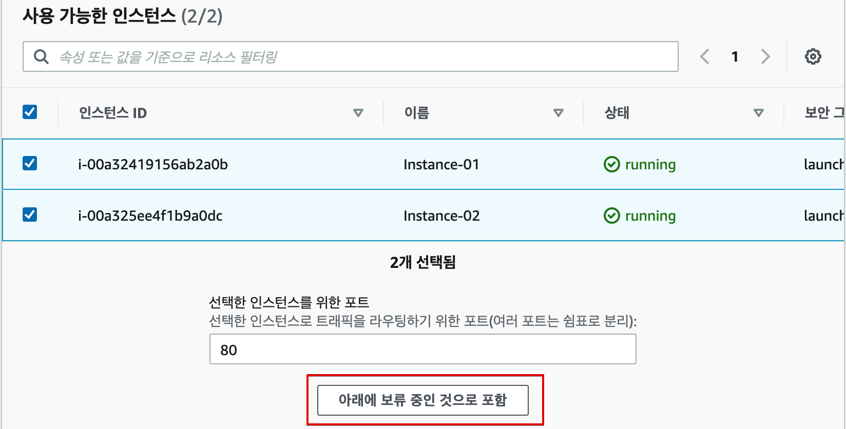 3. 실행 중인 두 인스턴스를 선택하고 선택한 인스턴스를 위한 포트를 80으로 설정한 뒤 아래에 보류 중인 것으로 포함 버튼을 클릭합니다.