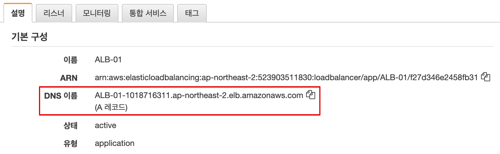 이제 EC2 대시보드의 로드 밸런서에서 방금 생성한 로드 밸런서의 DNS이름을 복사합니다.