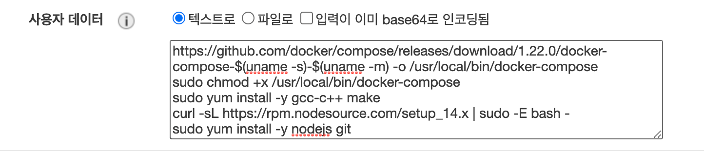 5. 사용자 데이터 섹션 아래에 이 스크립트 코드를 붙여 넣어 node.js Docker 앱을 실행하기 위한 필수 소프트웨어를 설치하게 합니다.