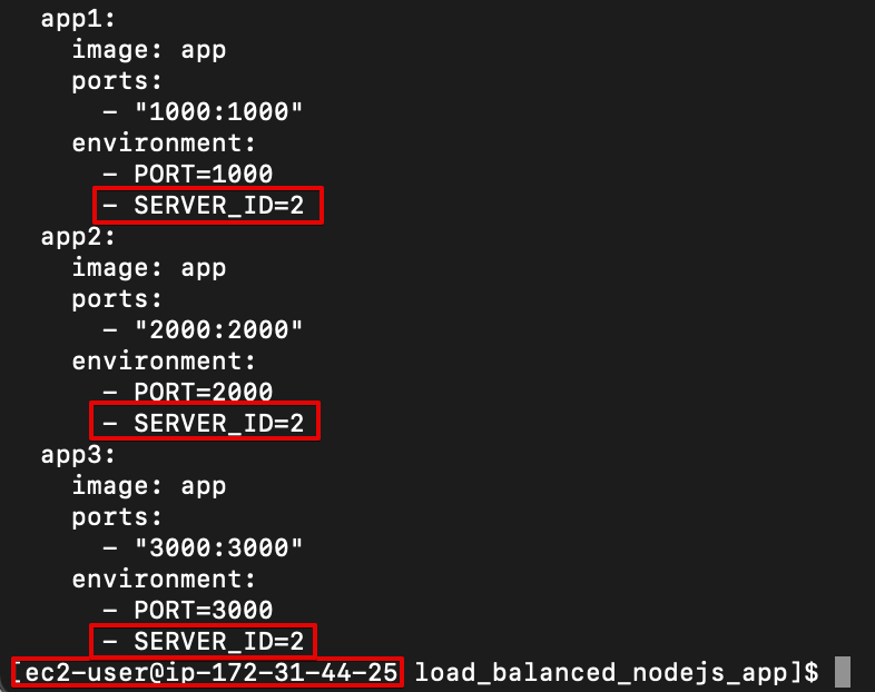 5. 두 번째 서버는 docker-compose.yml 파일을 수정해야 합니다. env 변수중 SERVER_ID는 모든 앱인 app1, app2, app3에 대해 2로 변경해야 합니다.
